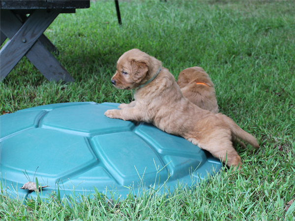 Our puppies are five weeks old today. This week, we introduced them to their outdoor playground.